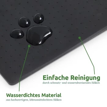 Die Futterunterlage besteht aus biegsamem, langlebigen und 100 % lebensmittelechtem Silikon. Die Oberfläche ist besonders rutschfest durch die dort befindliche Noppenstruktur und besitzt durch den extra hohen Rand einen Auslaufschutz. So gehören Wasserflecken und Futterreste der Vergangenheit an. Zudem ist sie wasserdicht und entsprechend sehr leicht zu reinigen.