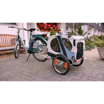 Der Fahrradanhänger hat einen stabilen Metallrahmen und ist aus widerstandsfähigem, pflegeleichtem Polyester gefertigt. Am vorderen Eingang befindet sich ein Wind- und Regenbezug, damit du den Anhänger bei jedem Wetter nutzen kannst.