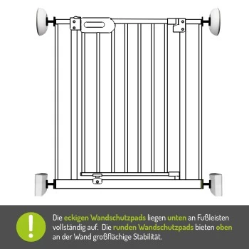 Unsere Wandschützer sind als 2er oder 4er Sets in den Farben Weiß und Grau erhältlich. Sie sind kompatibel mit den meisten handelsüblichen Hunde- und Katzengittern auf dem Markt. Die Wandschutz-Pads werden zwischen der Wand und den Klemmschrauben des Treppengitters festgeklemmt. Durch die Verwendung der Elefantenfüße wird der Druck des Gitters auf eine größere Fläche verteilt, was Risse und Beschädigungen an der Wand verhindert. Die Wandschützer bieten zusätzliche Stabilität und sind rutschfest. Sie sorgen dafür, dass das Gitter sicher an der Wand befestigt ist und nicht verrutscht. Dank der einfachen Klemmmontage können Sie die Wandschützer schnell und unkompliziert anbringen.