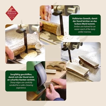 Die ChronoBalance Kaustangen aus 100% Hirschgeweih werden ausschließlich aus abgeworfenen Hirschgeweihen gefertigt – niemals von Schlachttieren. Rot- und Damhirsche sowie Rehböcke werfen ihr Geweih einmal im Jahr auf natürliche Weise ab. Die aus dem Wald von Hand gesammelten Geweihstangen werden halbiert, abgeschliffen und in die richtigen Größen zurechtgeschnitten, um einen hochwertigen Kauknochen für kleine und große Hunde zu garantieren. Durch die Halbierung kann das Innere der Geweihstange und damit die wertvollen Mineral- und Nährstoffe heraus gekaut werden.