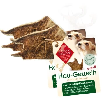 Das ChronoBalance Kaugeweih ist ein reines Naturprodukt und wird aus 100% abgeworfenem Damhirschgeweih gefertigt – für die Produktion werden keine Schlachttiere verwendet. Damhirsche werfen ihr Geweih einmal im Jahr auf natürliche Weise ab. Die aus dem Wald von Hand gesammelten Geweihstangen werden abgeschliffen und in die richtigen Größen zurechtgeschnitten, um einen hochwertigen Kauknochen für alle Art von Hunden zu garantieren.