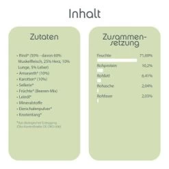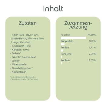 Das ChronoBalance Nassfutter mit Bio-Rind ist eine vollwertige Nahrung für Feinschmecker-Hunde. Ein hoher Fleischanteil sowie eine fein abgestimmte Rezeptur stellt die Nährstoffversorgung Ihres Hundes sicher. Rindfleisch ist besonders nährstoffreich und verleiht dem Futter ein kräftiges Aroma. Dieses bleibt durch die schonend verarbeiteten Zutaten bestmöglich erhalten. Das Rindfleisch hat eine besonders hochwertige Aminosäuren-Zusammensetzung, sodass Ihr Hund mit bestem Protein versorgt wird. Proteine sind wichtig für viele Körperfunktionen und den Muskelaufbau.