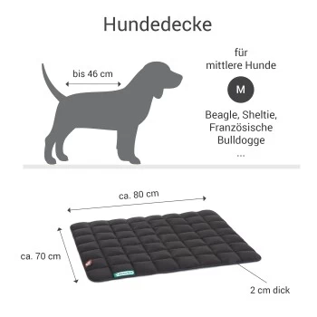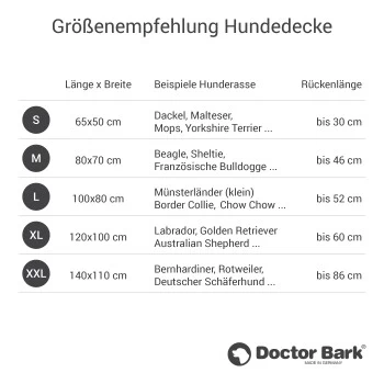 Doctor Bark Decken für Hunde – stylisch, hochwertig & sauber. Die Hundedecke für daheim und unterwegs!!! Doctor Bark verwendet nur die hochwertigsten Materialien zur Herstellung von Hundedecken, -kissen und -betten. Somit ist das Obermaterial, aus einem Baumwoll-Mischgewebe, höchst strapazierfähig und kochfest. Die Waschbarkeit im GANZEN bei 95°C wird durch unsere spezielle und weltweit einzigartige Verarbeitungstechnik des Füllmaterials erzielt. Durch die Wäsche bei 95°C werden alle Bakterien, Pilze, Viren und Parasiten, wie beispielsweise Hausmilben, tief im inneren Gewebe abgetötet und ausgewaschen. Intensiver Schmutz und hartnäckige Flecken werden bei einer 95°C Wäsche restlos beseitigt. Größe: M: ca. 80 x 70 x 2 cm und passt in eine 5 Kg Waschmaschine, L: ca. 100 x 80 x 2 cm und passt in eine 5 Kg Waschmaschine, XL: ca. 120 x 100 x 2 cm und passt in eine 5 Kg Waschmaschine, XXL: ca. 140 x 110 x 2 cm und passt in eine 8 Kg Waschmaschine.