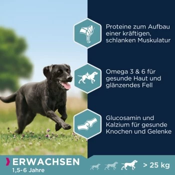 EUKANUBA Trockenfutter-Kroketten sind reich an frischem Huhn und perfekt für große ausgewachsene Hunde im Alter von 18 Monaten bis 6 Jahren (oder 2 bis 5 Jahre für sehr große Rassen). Die maßgeschneiderte Ballaststoffmischung aus präbiotischen FOS und Rübenschnitzeln fördert eine gesunde Verdauung. Darüber hinaus fördern die EUKANUBA Kroketten dank der natürlichen Quellen von Omega-6 und Omega-3 eine gesunde Haut und ein glänzendes Fell. Das Futter enthält auch Glucosamin und Kalzium für gesunde Gelenke und starke Knochen sowie die Antioxidantien Vitamin E & C zur Unterstützung des Immunsystems des Hundes. Zusätzlich unterstützen die einzigartigen sechseckigen EUKANUBA Kroketten und das Zahnpflegesystem DentaDefense langfristig saubere und gesunde Zähne. Das in EUKANUBA enthaltene L-Carnitin unterstützt den Abbau von Körperfett und ermöglicht es Ihrem Hund, ein optimales Gewicht beizubehalten, wodurch die Gelenke weniger belastet werden. Das Futter ist 100 % vollwertig und ausgewogen. Eine innovative Rezeptur für große ausgewachsene Hunde zur Unterstützung einer optimalen Körperkondition, damit sich Ihr Hund ein Leben lang wohlfühlt.