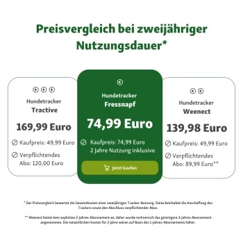 Der Fressnapf GPS-Tracker für Hunde ist der einzige seiner Art, der kein Abomodell nutzt. Das heißt, für einmalig 74,99 Euro haben Sie garantiert 2 Jahre lang keine monatlichen Kosten.