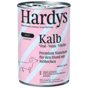 Gesunde Ernährung von klein auf! Neben einer liebevollen Erziehung ist das Menü Hardys Junior ein gesunder Entwicklungsbaustein für Ihren jungen Hund. Das in diesem Welpenfutter enthaltene fettarme Kalbfleisch bietet Kalzium für den Knochenaufbau, feine Möhrchen und knackige Äpfel liefern wichtige Pflanzenfaserteile, Fenchelsamen, Grünlippmuschelextrakt und Hagebuttenpulver unterstützen die Gelenke und die Verdauung. So wird Ihr Welpe ganz sicher groß und stark!
