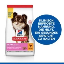 HILL’S SCIENCE PLAN Small & Mini Light Adult liefert eine Ernährung, die speziell auf weniger aktive erwachsene Hunde kleiner Rassen und Zwergrassen abgestimmt ist, die zur Erhaltung eines gesunden Gewichts und fĂĽr einen gesunden Lebensstil eine Nahrung mit niedrigem Kaloriengehalt benötigen.