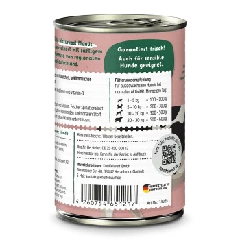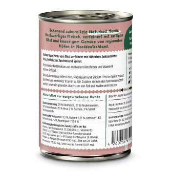 Unsere Knuffelwuff Naturkost Rind mit feinem Hühnchen, Hirse, Zucchini und Spinat stellt eine garantiert vollwertige, frische und vitaminreiche Kost für deinen Knuffel dar. All unsere Zutaten dürfen nur den allerhöchsten Lebensmittelstandards entsprechen und garantieren somit auch für sensible Fellnasen eine optimale Ernährung. Unser Premium-Futter kommt ohne künstliche Aromen-, Farb- und Konservierungsstoffe aus und ist aufgrund seiner hochwertigen Zutaten nicht nur überaus lecker, sondern dank der wertvollen Proteine, Nährstoffe, Kohlenhydrate, Mineralien und Spurenelemente vor allem auch sehr gesund. Ebenso sind die Knuffelwuff Futterdosen getreide- und glutenfrei. Denn schließlich verfolgen wir eine unverkennbare Philosophie: