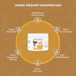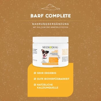 Mit unserem extrem ergiebigen getreidefreien Medidog Barf Complete Ergänzungsmittel für alle Hunderassen gibst du deinem artgerecht mit Rohfleisch gefütterten Hund eine zusätzliche Kalziumquelle für starke Zähne und gesunde Knochen.