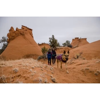 Das integrierte Geschirr bedeutet, dass die Leine sicher an zwei Befestigungspunkten angebracht werden kann: am Rücken und an der Brust – ideal, um Hunde umzuleiten, die gerne an der Leine ziehen. Kleine Dinge gehen in die zwei Reißverschlusstaschen. Das ist eine Jacke, die immer einsatzbereit ist, wann immer du und dein Hund es sind.